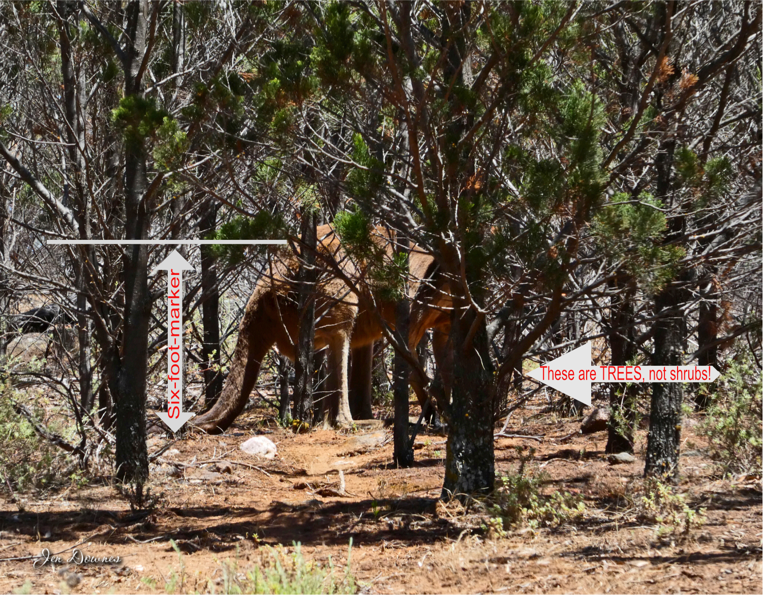 So we walked on, and heard Thunderfoot and his enormous missus boom off into the bushland. It was thrilling, a little bit scary -- like almost but not quite blundering into a grizzly bear in bush Alaska. I wouldn't trade the experience for anything, yet at the same time, I hope not to repeat it! I honestly did not know that roos grew this big -- and yes, I know exactly what the official documentation says! But I also know what Dave and I experienced. We're savvy people, and entirely used to Clydesdale horses, wild bull moose in Kincaid Park, camels ... those taxidermed bears in the big glass cases at Anchorage Airport! We know what we saw.